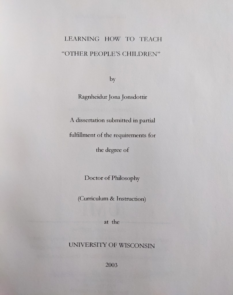 Tilgangur hennar er fyrst og fremst að deila með börnunum mínum og öðrum áhugasömum upplestri á doktorsritgerð minni frá Wisconsinháskóla: Learning How to Teach “Other People’s Children.”